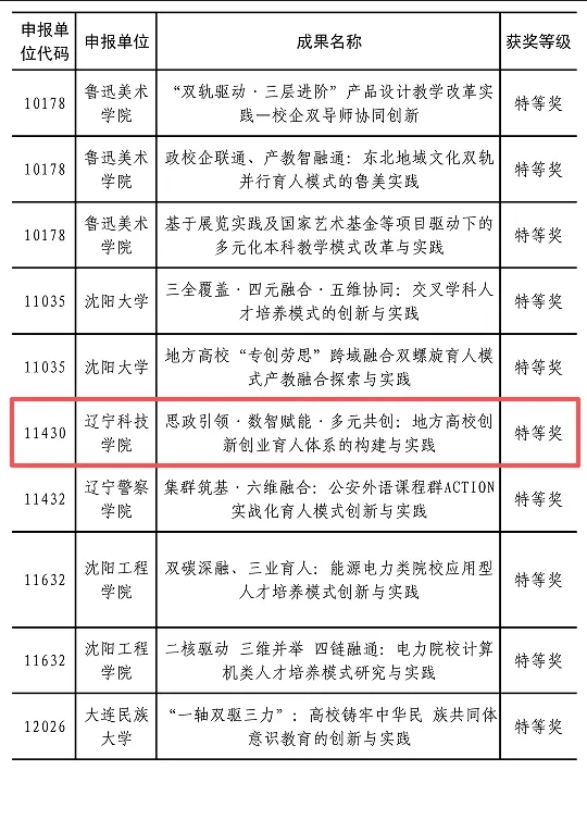 本次大赛中,辽宁科技学院凭借“思政引领·数智赋能·多元共创:地方高校创新创业育人体系的构建与实践”成果获得特等奖。该成果紧扣立德树人根本任务,立足辽宁地方产业实际,以思政引领为核心方向、数智赋能为技术支撑、多元共创为实施路径,创造性地将三者有机融合,精准回应地方高校在服务区域发展、培养应用型人才中的核心痛点,构建出一套具有鲜明特色、成效显著的创新创业育人体系,形成了较强的示范性与辨识度。